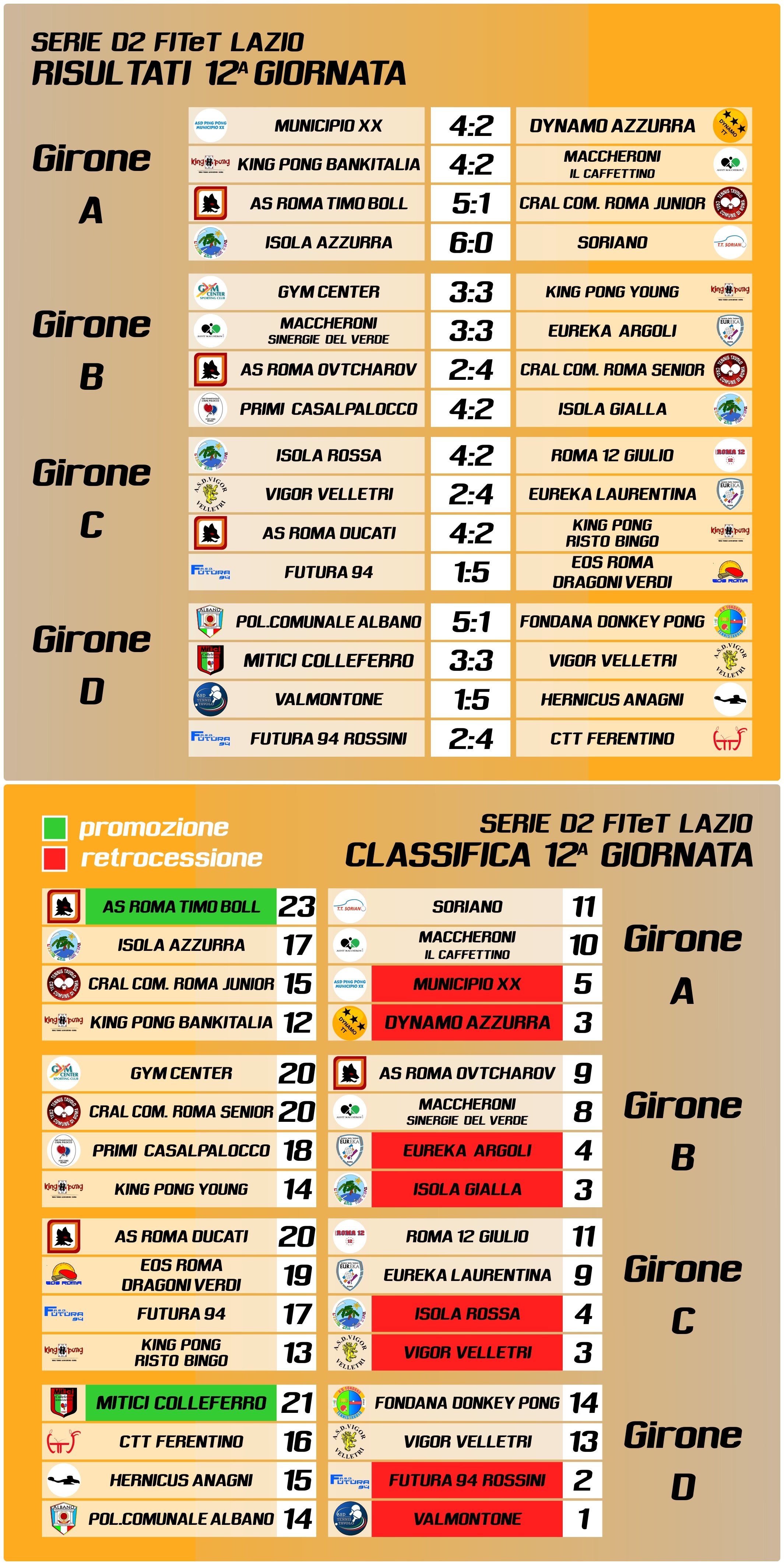 Più agguerrita, invece, la lotta al primo posto nel girone B dove ci sono in lizza ancora tre compagini: Maccheroni Asso Asso Immobiliare a 20, Eureka Roma a 19 e Cral Comune di Roma a 18.