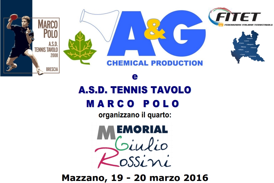 Sarà la società Tennis Tavolo Marco Polo, in collaborazione con il Comitato Fitet della Lombardia, a organizzare il prossimo 19 e 20 marzo 2016 il quarto Memorial Giulio Rossini. Le