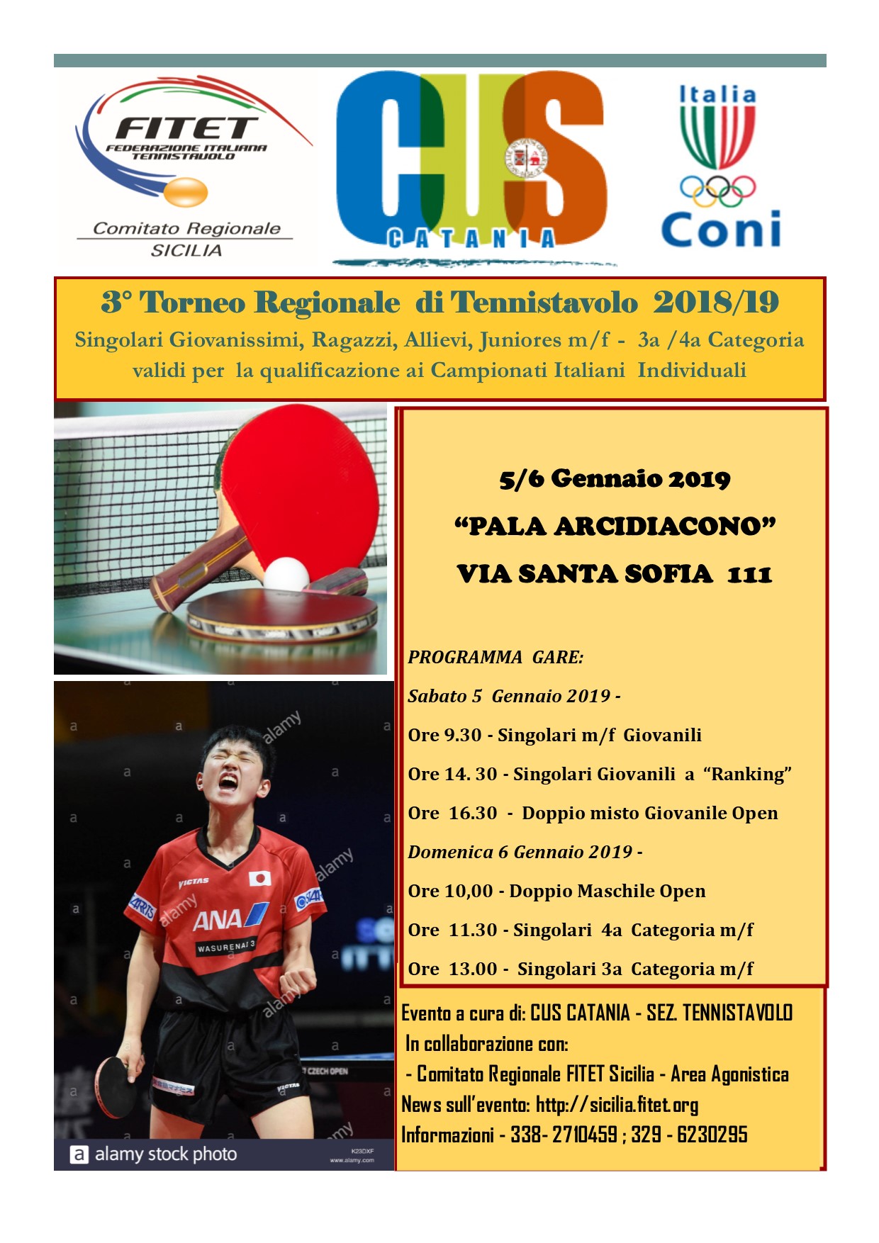 Si ricorda alle Società che il prossimo 2 Gennaio scade il termine per effettuare le iscrizioni al 3° Torneo Regionale Giovanile e di Categoria, valido per la qualificazione ai Campionati Italiani, che si svolgerà a Catania, i prossimi 5/6 Gennaio presso l'impianto del Cus Catania PalaArcidiacono di via Santa Sofia, 111.
