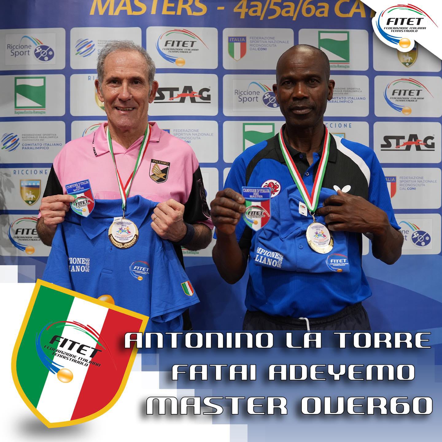 Dopo la medaglia d’oro conquistata nel doppio 60-65 nella scorsa edizione dei campionati italiani, Antonino La Torre (Sportenjoy) in tandem con Fatai Adeyemo (C.I.A.T.T. Firenze) ripetono l’exploit, dall’alto di una superiorità evidente sin dalle prime battute. Nei quarti ad avere la peggio è il duo formato da Gianpaolo Esposito e Giuseppe Santillo (Circolo Internazionale-San Nicola Caserta) che subiscono una pesante lezione perdendo per 11-4/11-6/11-4. Nel penultimo atto è la volta di Bruno Esposito e Alessandro Ciceri (Giovanni Castello-Arengario Monza) che cedono per 11-4/11-9/11-8 contro il bravo Adeyemo ben supportato da La Torre, apparso in ottima forma. In finale i vincitori della categoria affrontano Francesco Cosci e Alberico Gualfetti (Lib. T.T. Siena) che riescono nell’impresa di vincere un primo rocambolesco set per 11-9; dopo, La Torre e Adeyemo ingranano la marcia giusta e si impongono nei successivi tre parziali per 11-3/11-4/11-5, archiviando la pratica.