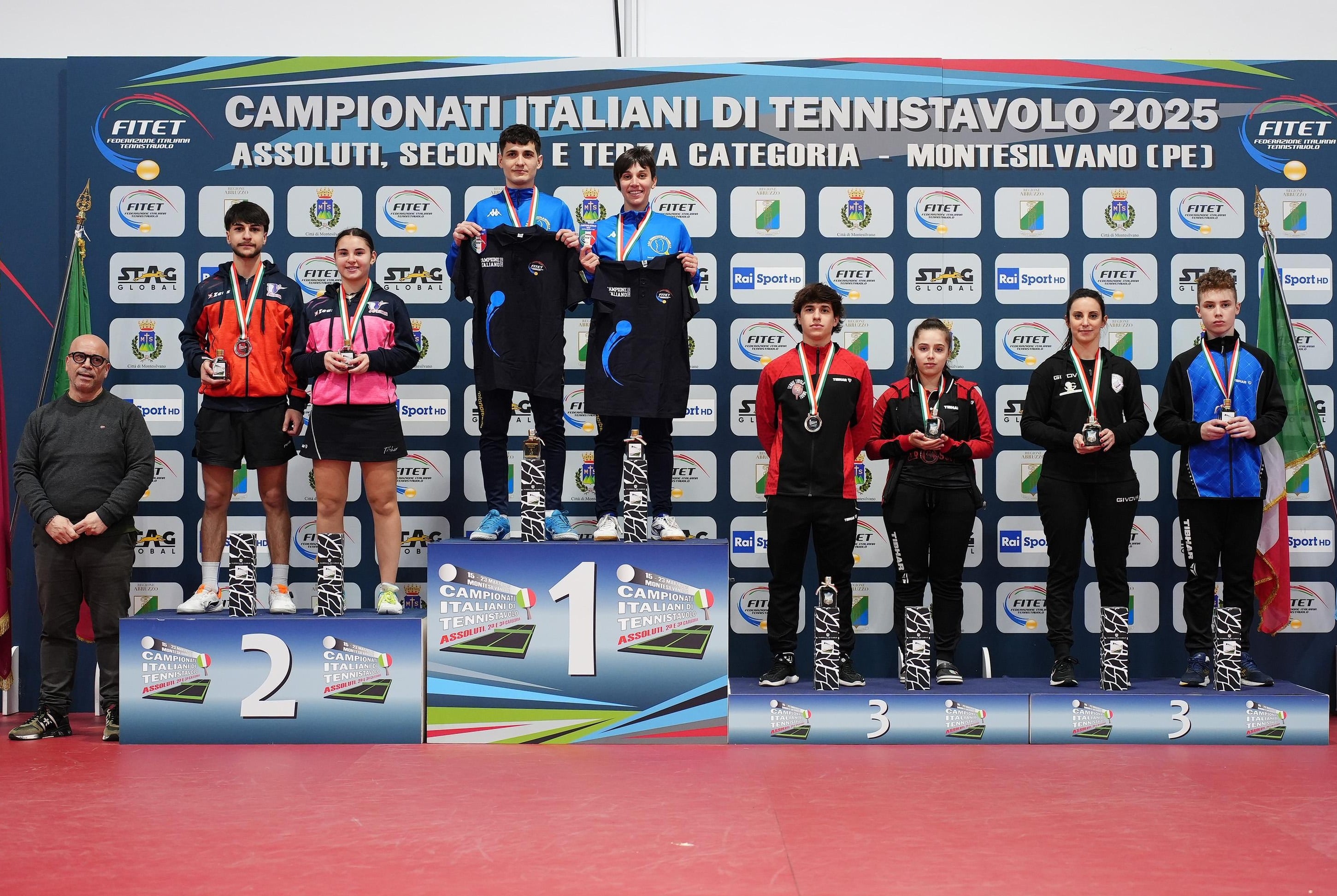 -Uno stratosferico Danilo Faso - 14 anni - che ha già un ricco palmares anche a livello internazionale, ha conquistato un bis di ori in doppio e in singolare e un bronzo nel doppio misto ai campionati italiani di seconda categoria. Il bravissimo atleta, tesserato con il Top Spin Messina e girato in prestito alla Virtus Servigliano in serie A1, in tandem con Francesco Trevisan -15 anni - (T.T. Silver Lining) compagno di nazionale e di tante avventure, ha messo in fila fior di coppie, fra cui il duo formato da Alessandro Baciocchi e Paolo Bisi (T.T. Sassari-T.T. Marco Polo), accreditato con la testa di serie n. 1 e vincendo nell’ultimo atto Tomas Sanchi e Antonio Giordano (T.T. Torino-T.T. Muravera) con il punteggio di 11-7/13-11/11-6.